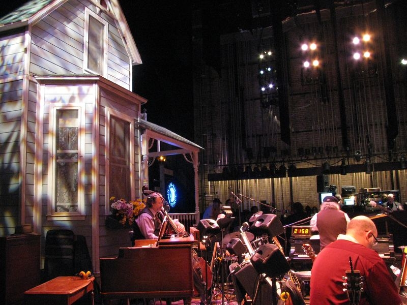 The clock positioned centerstage counts down the minutes (21 minutes 58 seconds) when Garrison Keillor's live performance of Prairie Home Companion will be simultaneously broadcast on the radio Saturday, the 14th of September 2013. Dick and I are seated stage right (house left) so close to the musicians, radio script actors, sound effects man… and Garrison Keillor… that we didn't dare sneeze lest it would be heard over the air waves.