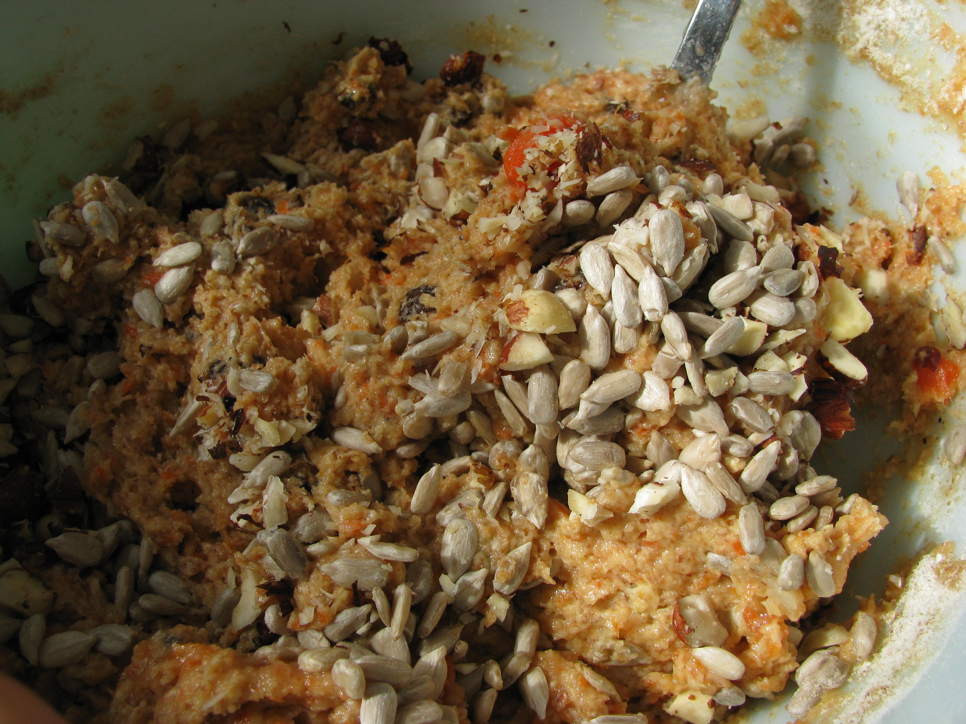 Pureéd carrots and parsnips are added to the liquid ingredients then combined with the dry. Raisins provide sweetness while raw sunnies and hazelnuts add crunch. Finely chopped Brazil nuts sprinkled atop each cookie looks like a dusting of freshly fallen snow.