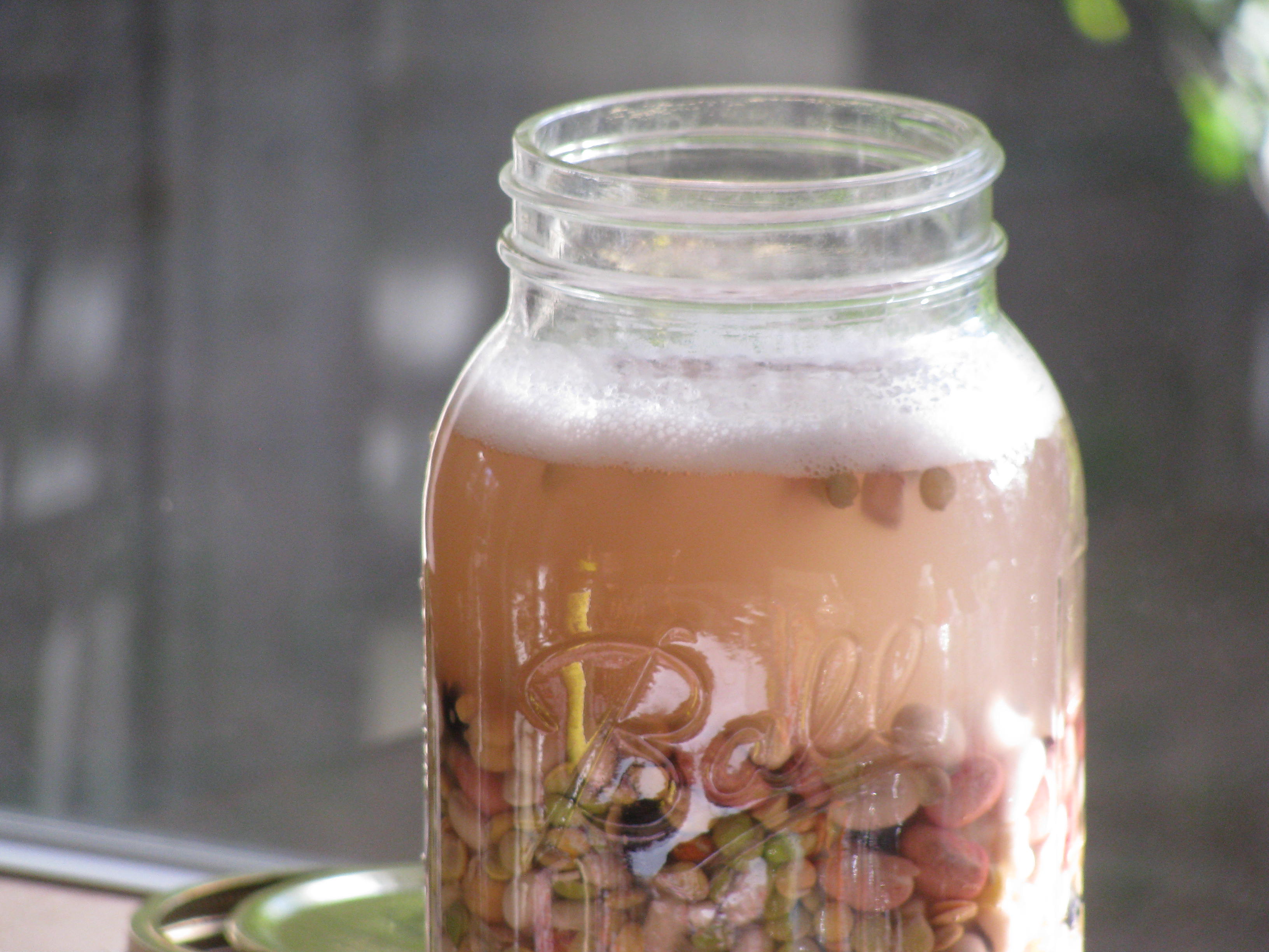 Foam will form during the soaking process as evidenced in this bean mix that I allowed to soak in a water/vinegar solution for 36 hours on my kitchen counter. Increased digestibility may be attained by draining and replenishing the acid or alkaline solution midway during the soaking process.
