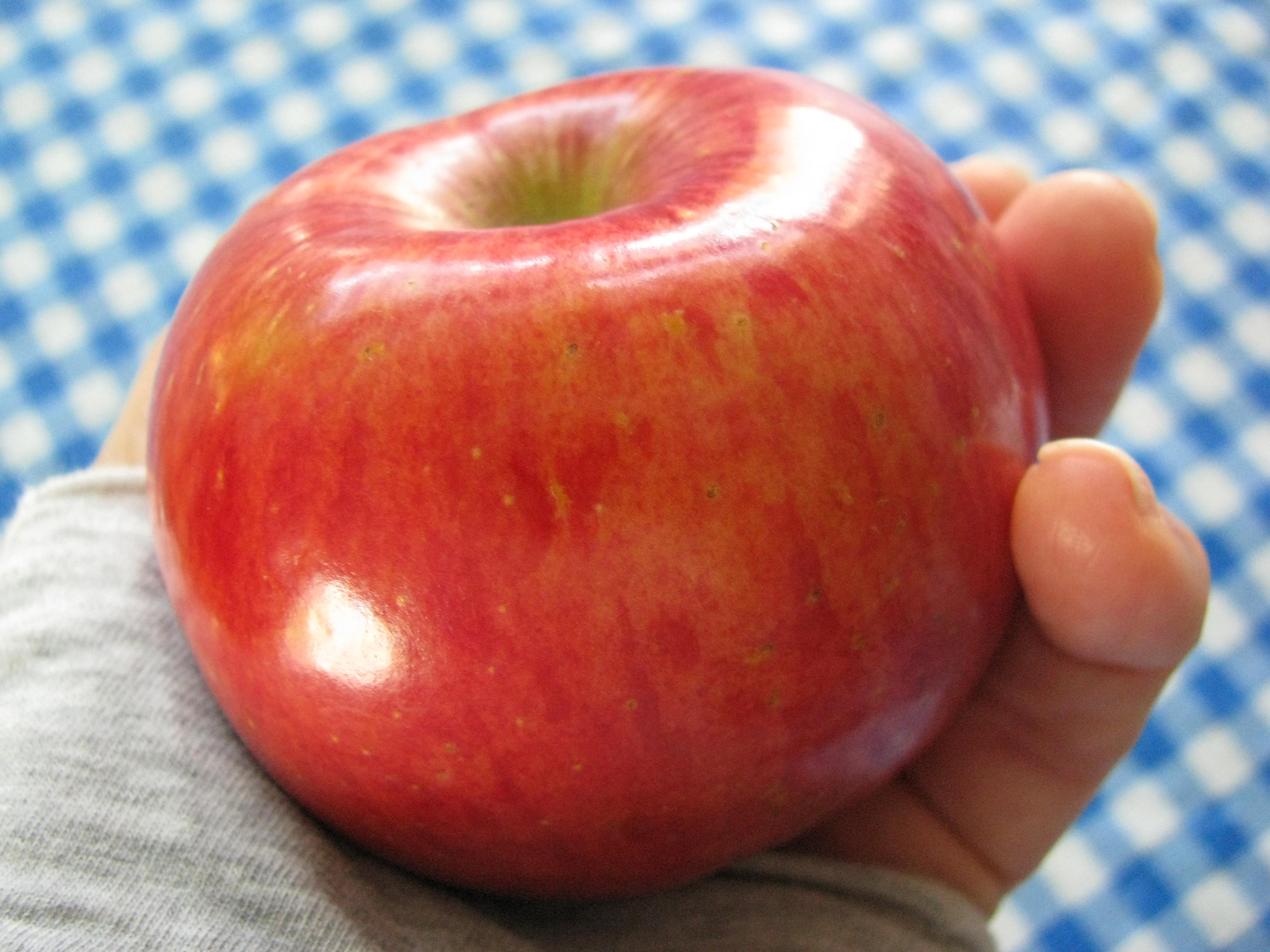 This apple's beautiful coloring reminds me of a crayon resist elementary school art project. Imagine a ruby-red crayon to make blotchy stripes then yellow watercolor paint brushed over top to fill in the gaps and create the background color. I discovered the apple during a routine sweep through the organic produce bins at my local supermarket yesterday. Its name is "Kiku."