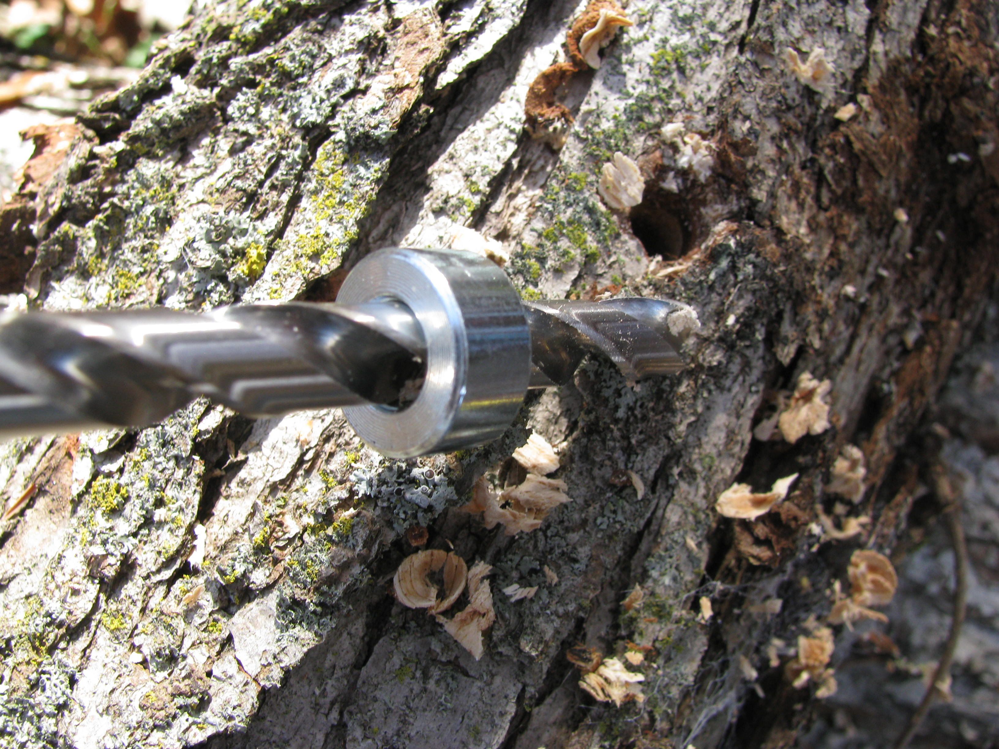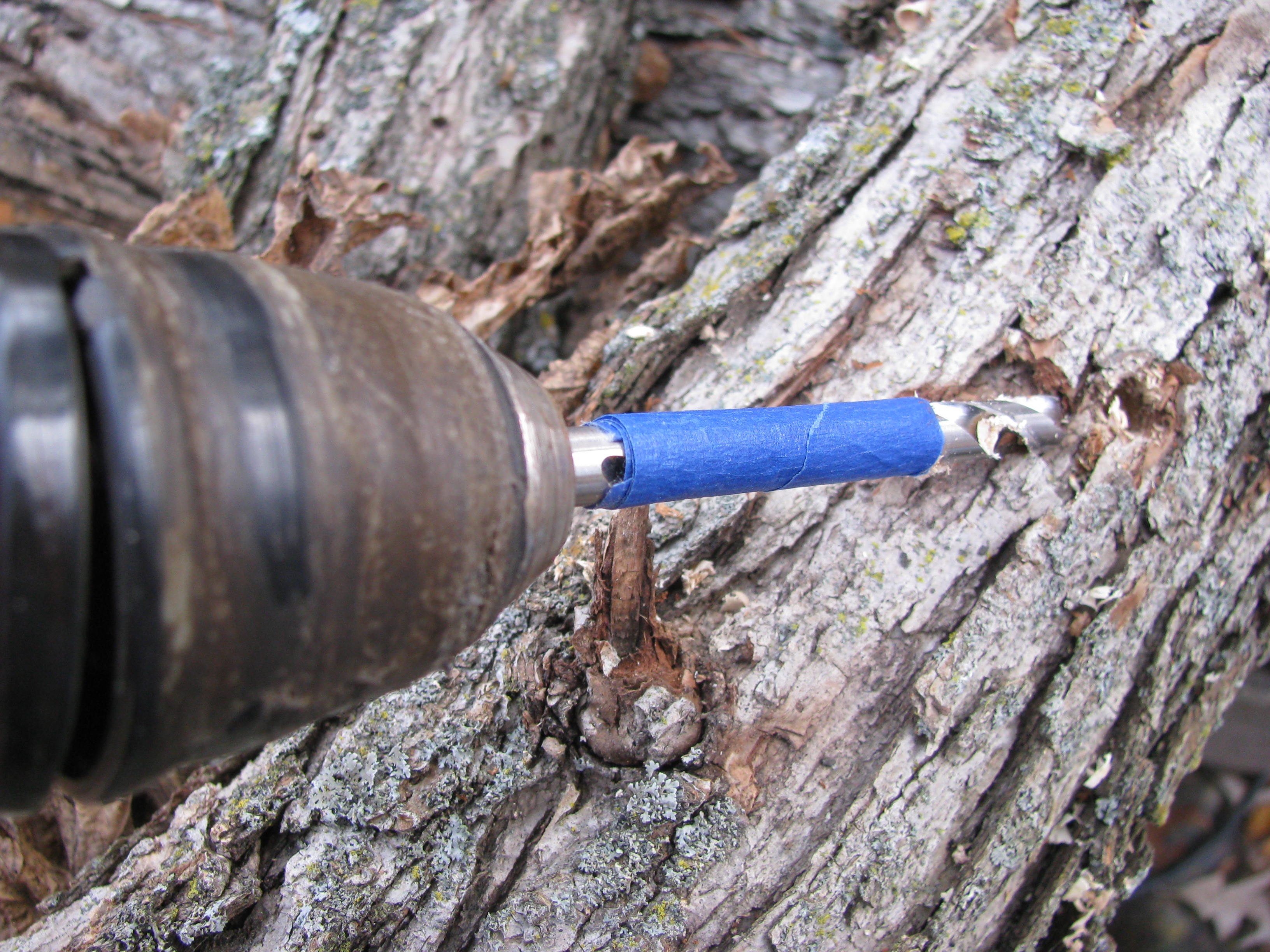 Independently gathering plug spawn insertion supplies is an option, but I chose to order a kit that included a 5/16" drill bit with a stop collar, rubber mallet, 1 lb soy-based sealing wax, and a 1" wax application brush. As I began to drill the "2-inch deep holes no more than 4 inches apart, evenly spaced in a diamond pattern along the length and around the full circumference of the logs," the drill bit's stop collar kept slipping, so I subbed a strip of painters' masking tape wrapped around the bit.