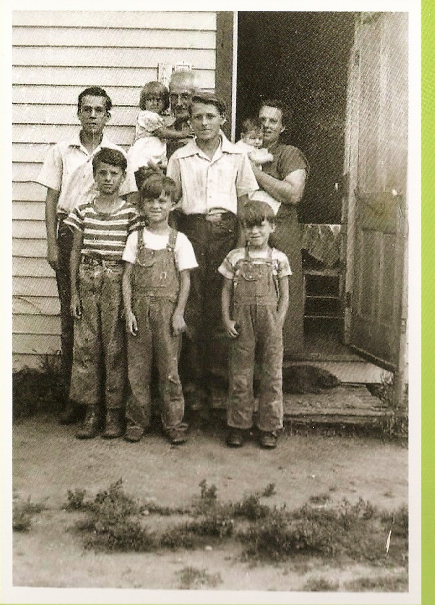 It has the look of homesteaders as in Laura Ingalls Wilder's day. The old door opening into the kitchen with the tablecloth so welcomingly draped over the table, the bib overalls (handed down from one to the next), the dirt-packed yard with patches of weeds… My mother's apron is missing. She always wore a bib apron. The baby in my mother's arms is my sister Rita. My father is holding me. My brother Greg and a sister Mary Ann are missing from the photo and there were three more not yet born (Ron, Rick, and Marlene) when this photo was taken making a total of 12 kids in all. The others in the photo L to R back row in front of my dad and mom are Ken and Bill with David, Darrel, and Cliff L to R front row.