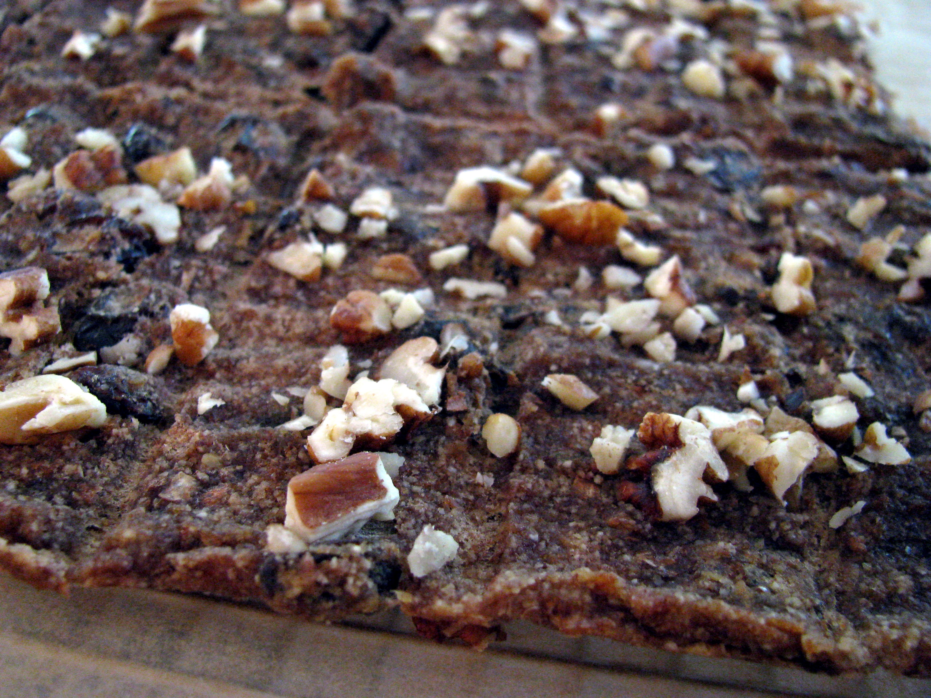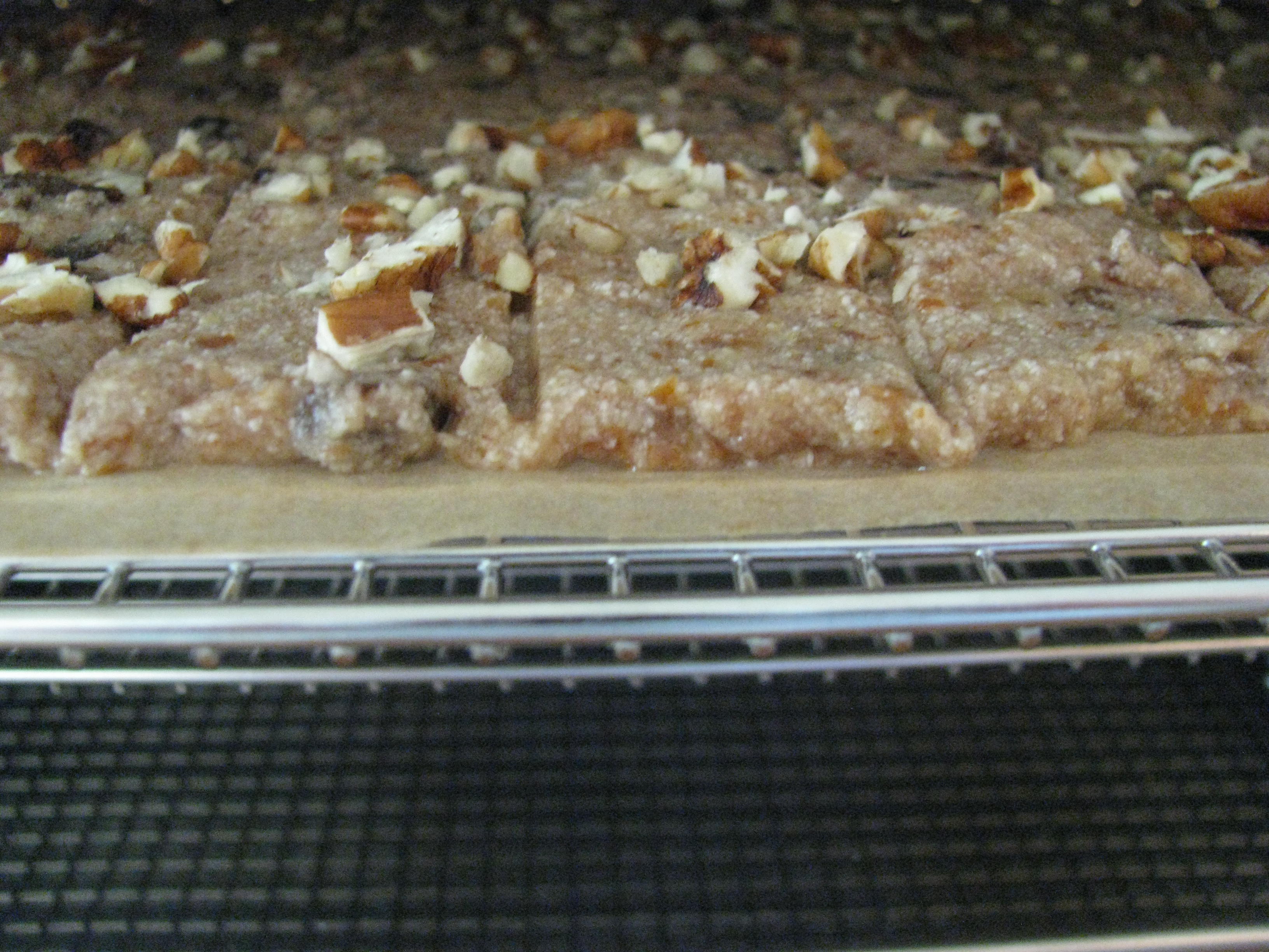 In a large bowl, stir to combine all ingredients except pecans. Line a dehydrator tray with a nonstick drying sheet (e.g. Excaliber’s ParaFlexx) or, as I prefer, unbleached parchment paper. Spread batter onto sheet ¼ “ thick. Square off edges and score into approximately 1 ¼” x 4” pieces. Optionally, sprinkle chopped pecans over batter’s surface. Dehydrate at 115° for 4-6 hours. Flip over and continue drying for another 4 hours until desired dryness. Store in airtight container for 5-7 days.