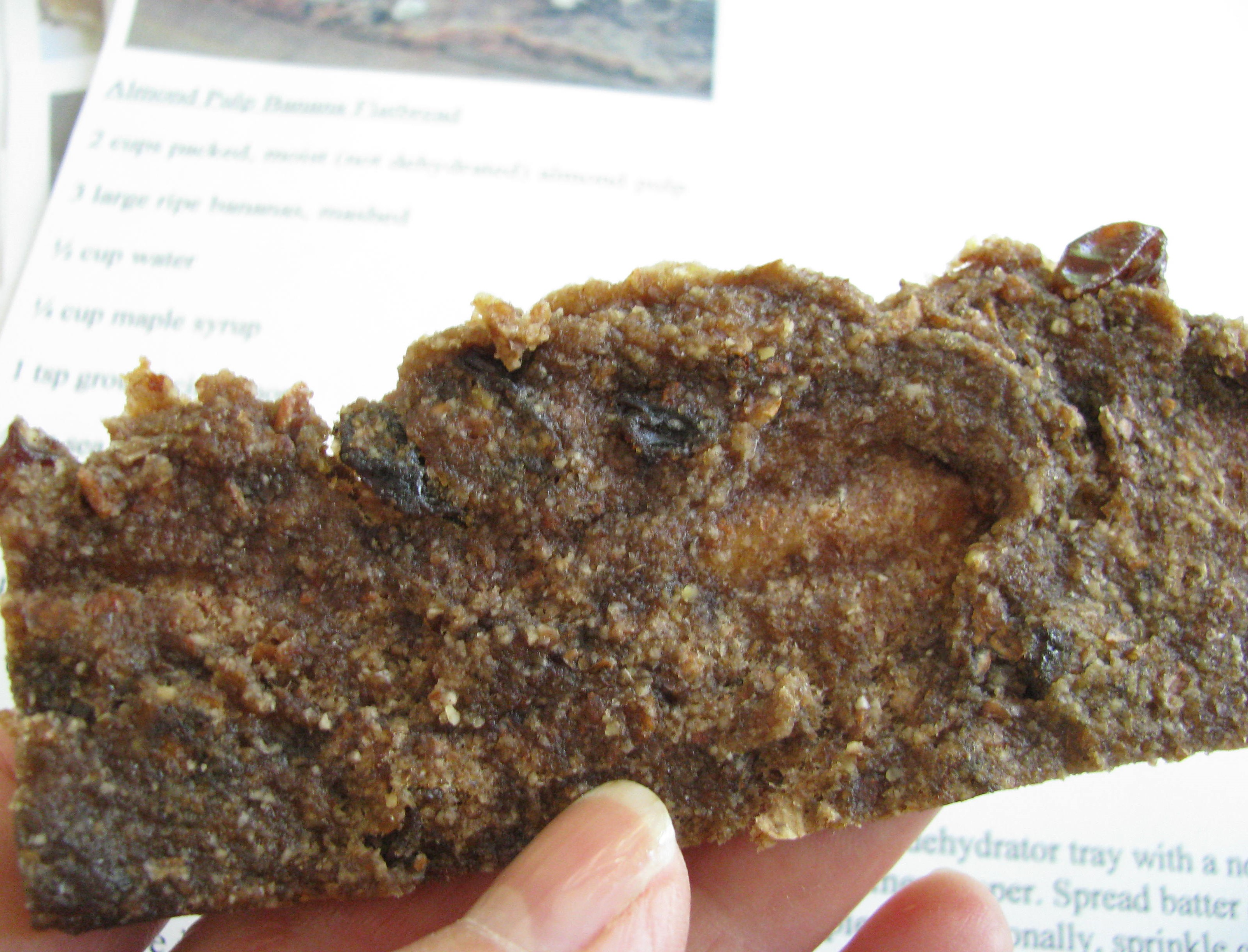 Here's a use for the pulp byproduct that you'll be generating if you're straining homemade nut milk. The original recipe's title is "Raw Banana Bread Toast Sticks." I chose to rename it "Almond Pulp Banana Flatbread" for two reasons. The recipe calls for 2 cups packed almond pulp. I found that I had enough pulp (2 cups) after making two batches of almond milk if I scooped the pulp into the measuring cup without packing. Although it resulted in less pulp than the recipe called for, the end-product turned out amazing, but it was reminiscent of fruit leather rather than toast. Secondly, I wanted the name to highlight almond pulp as an ingredient because that's the whole point of the recipe, afterall.