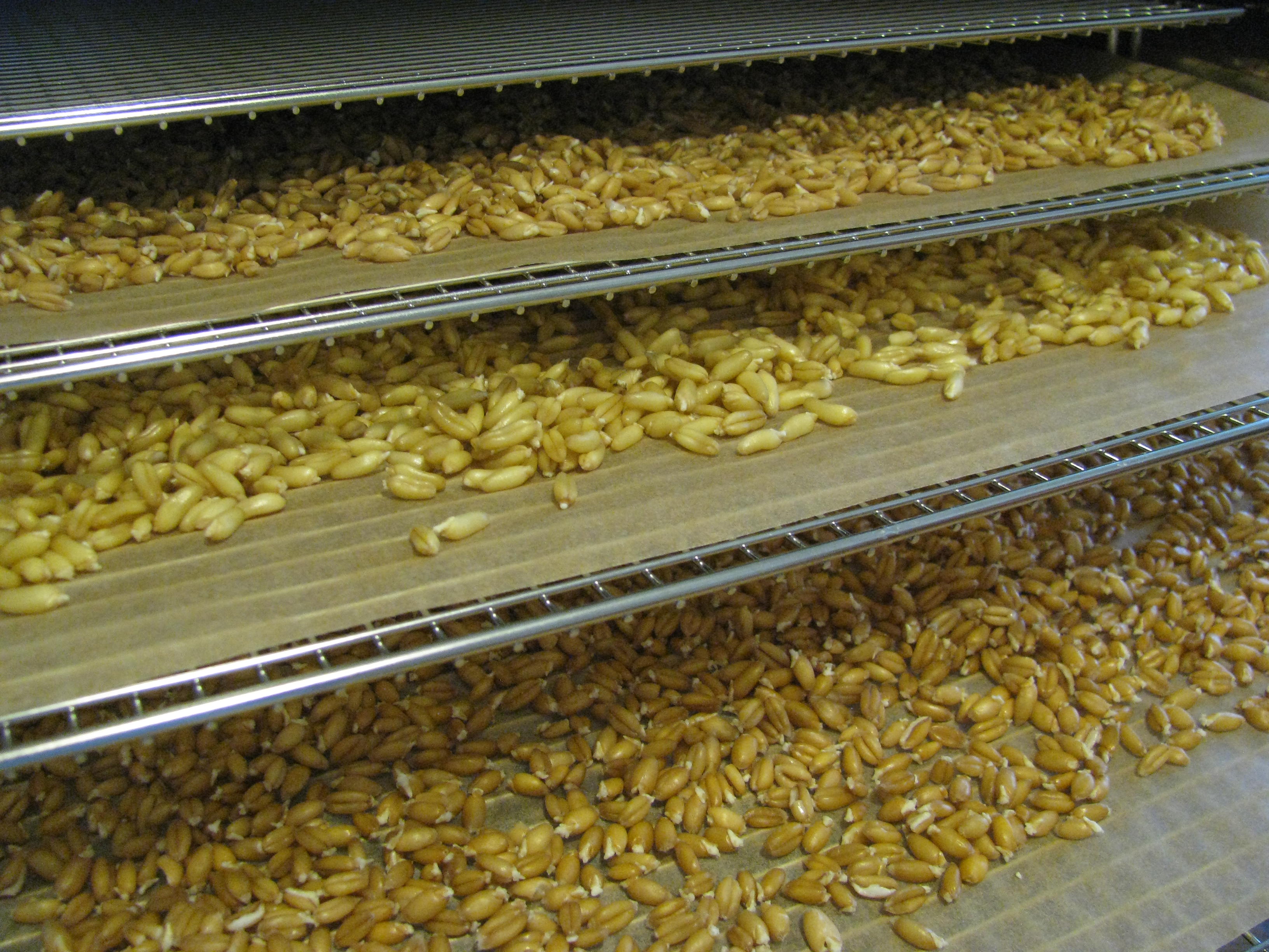 Put desired grain into a two-quart mason jar filling it halfway, then fill the jar almost to the top with distilled or filtered water. Screw on a screen sprouting jar lid. Rinse by shaking gently, then drain. Fill the jar again almost to the top with water and leave on counter overnight for 8-10 hours to soak. In the morning, drain the soak water. Fill the jar with fresh water and shake gently to rinse. Drain again, then tip the jar upside down at an angle so the remaining water drips out and to allow air flow. Every few hours, rinse the grain, drain, then tip the jar at an angle. Sprouting times will vary depending upon the grain, so monitor the progress. Look for a little sprout to form. You are aiming for "minimally sprouted" grain, not sprouts with longer tails that you'd grow as a salad topping. (Enlarge the photo on left to see what it looks like.) My time frame looked liked this. 10P-6A: Overnight Soak. 6A-11A: Drain, rinse, and drain. Rinse and drain. The sprouted grain was ready to dehydrate. I spread the grain onto dehydrator trays. 11A-5P: I dried the grain in my dehydrator at 105°. (Top Tray: Emmer Grain, Middle Tray: Kamut Wheat, and Bottom Tray: Spelt)