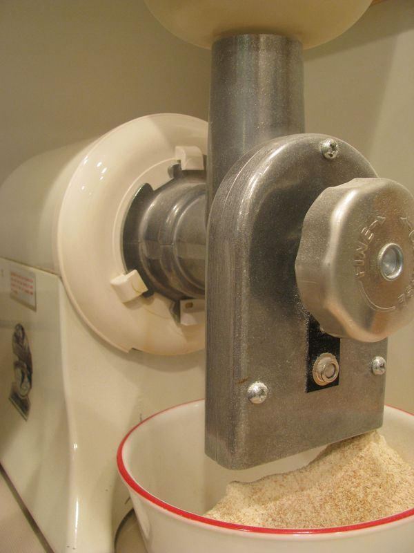 After dehydrating the sprouted grain until it was thoroughly dry, I ground it into flour using a grain mill attached to my Champion Juicer (left photo). Look at the lovely Emmer Grain Sprouted Flour! I also made Kamut Wheat and Spelt Sprouted Grain Flour. Store in the freezer for maximum "shelf-life."