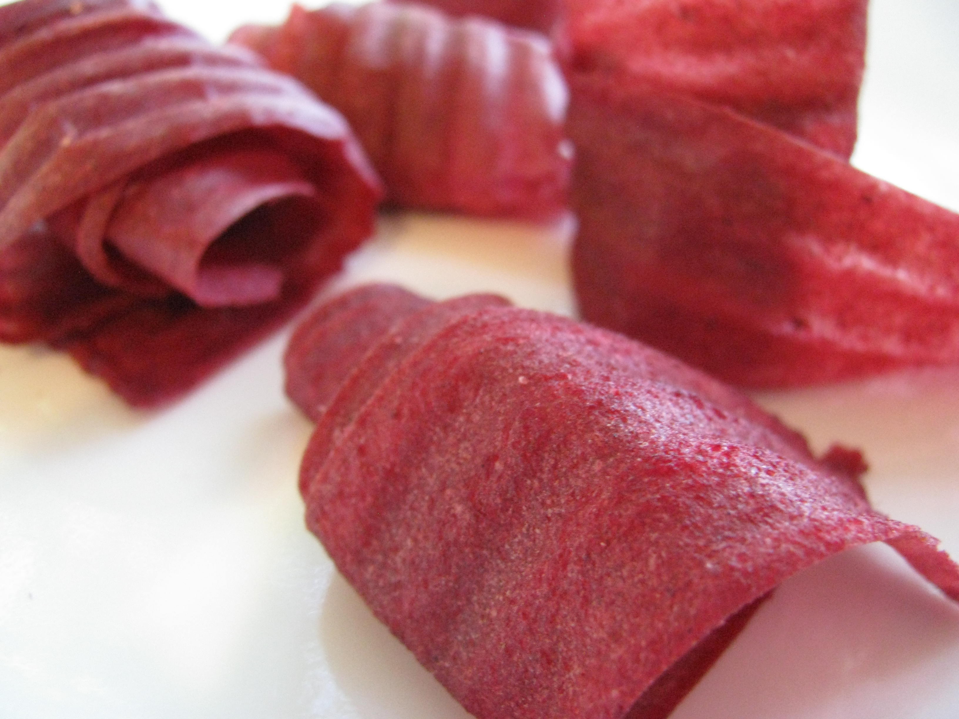 I would use a smaller chunk of beet next time. It's not that I tasted the beet. I didn't. I just think that a more vibrant red would be prettier. Maybe less beet would achieve that. What's up with the fruit leather's corrigated ridge pattern? I choose to line my dehydrator racks with natural parchment paper rather than using ParaFlexx sheets that have a PTFE (polytetrafluoroethylene-Teflon) coating. The wetness of the puree caused the parchment to mold to the shape of the metal racks. Did the puree soak through the parchment paper? No, not at all. Was the fruit leather difficult to peel off post dehydrating? No, the parchment released easily from the fruit leather.