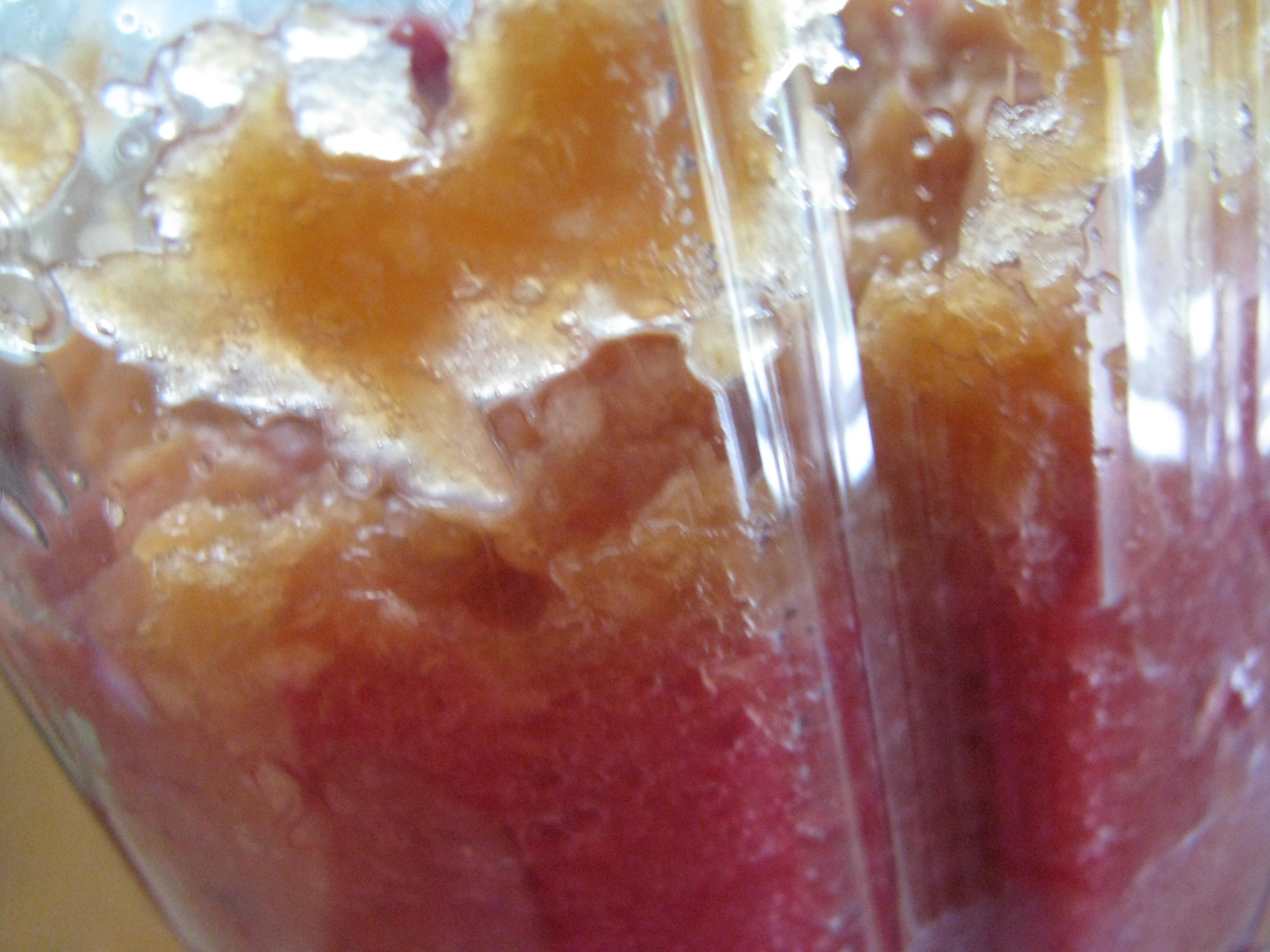 I made my first homemade fruit leather ever. The recipe came from my Winter 2014 issue of Sweet Paul Magazine p. 45. Apples, lemon juice, and a small chunk of beet for red color. Store-bought fruit roll-ups? Check out this strawberry fruit roll-ups label. Where are the strawberries? And the deceiving color? It comes from red 40, yellow 5 & 6, and blue 1 dyes. As you can see in this blender container closeup of the partially combined mixture, a beet rapidly turns browned oxidized apple puree into a lovely rosy hue… a perfect alternative to synthetic dyes.