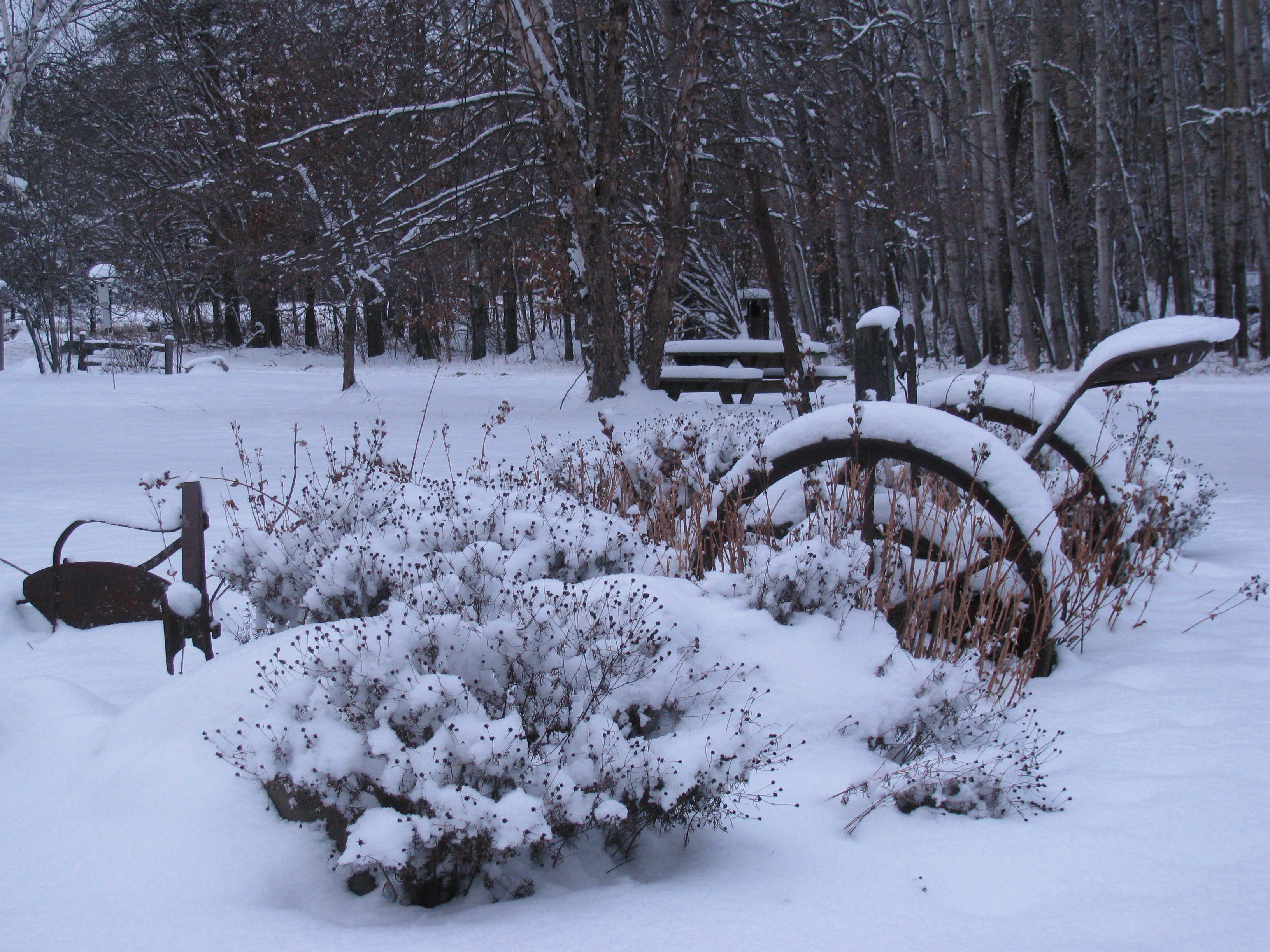 The tendency, during autumn cleanup, is to cut perennials back in preparation for spring regrowth. However, I choose to leave the stems and dried heads intact to provide texture and form to the landscape rather than a barren tundra. The dried blossoms catch and hold the snow forming fluffy tufts that are reminiscent of peony blooms. There will be time in early spring for trimming old growth.