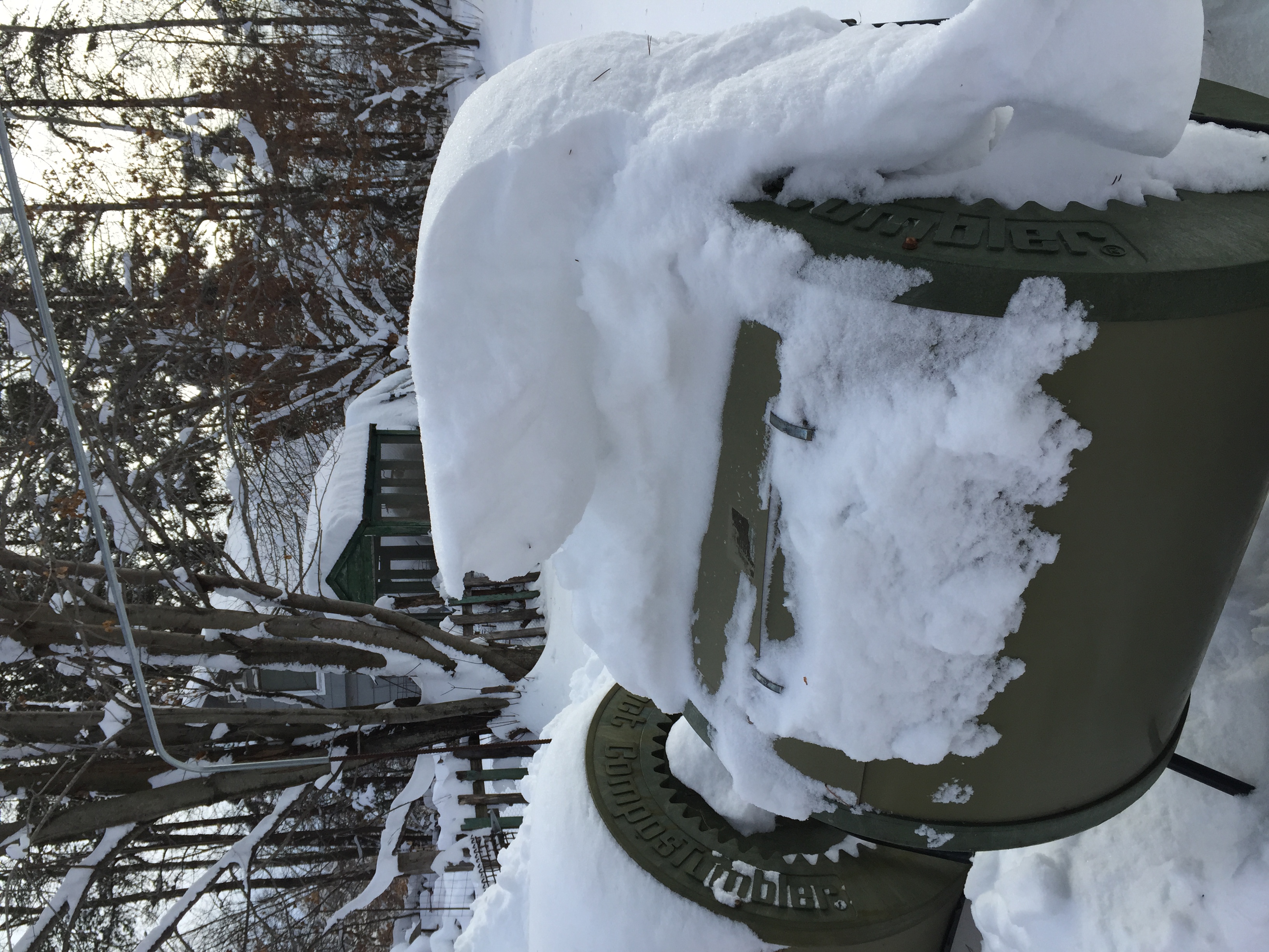 Throughout the winter, I continue to add fruit and veggie scraps to my two compost tumblers. Even though their frozen state prevents decomposition, in the first warm days of spring, the process begins anew. Nothing is wasted and so much to be gained in the rich, black soil that is created.