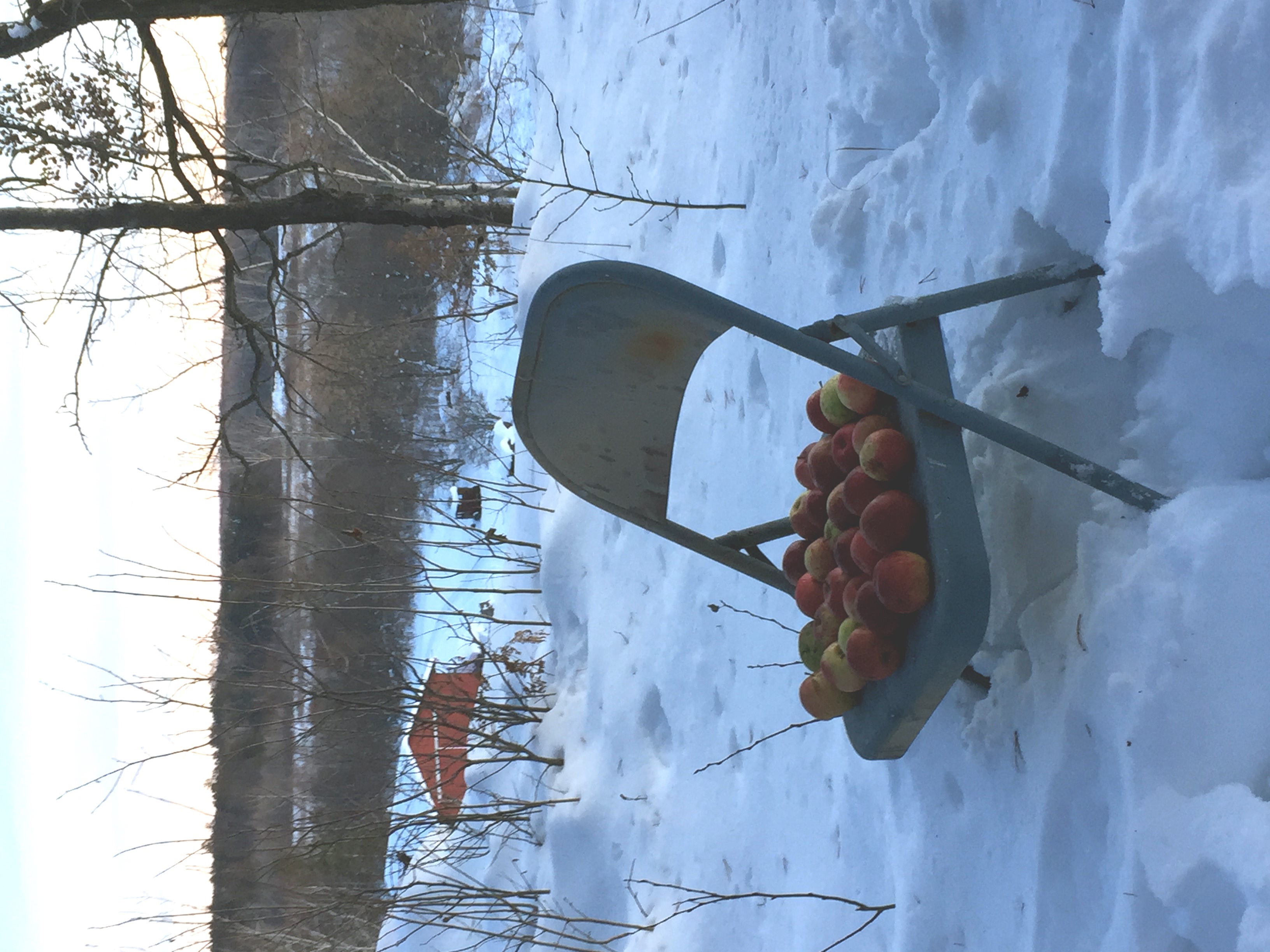 Three deer regularly visit our front yard to eat from a flowering crab tree heavily-laden with cherry-sized apples that determinedly cling to their branches despite winter's grip. Frustratingly, the deer believe that my perennials, shrubs, and young tree branches are free game, too. So, determined to retrain our visitors, Dick and I set some beyond-their-prime apples upon a chair along a pathway where we often sit. Far away from our house and the landscaping surrounding it.