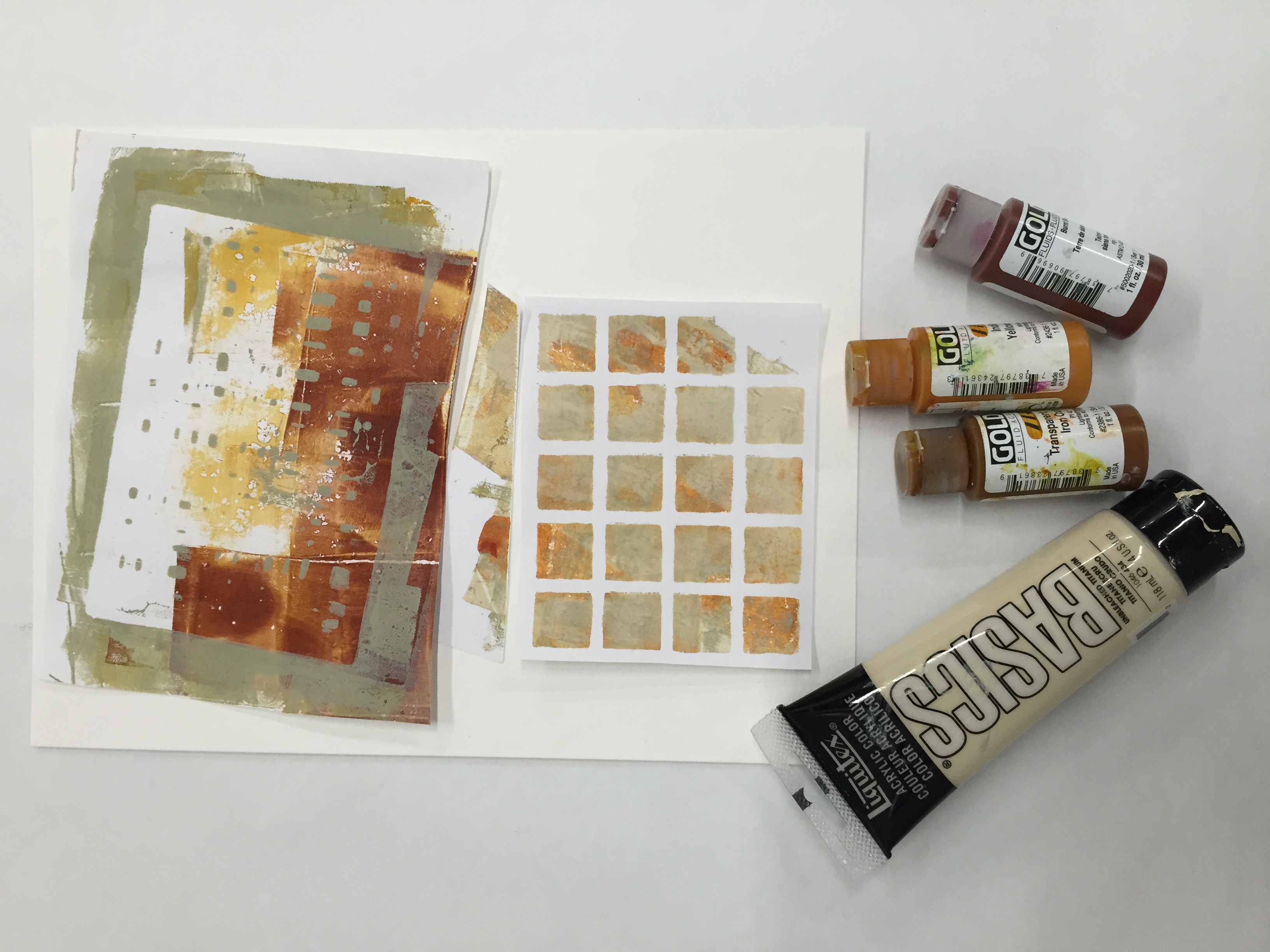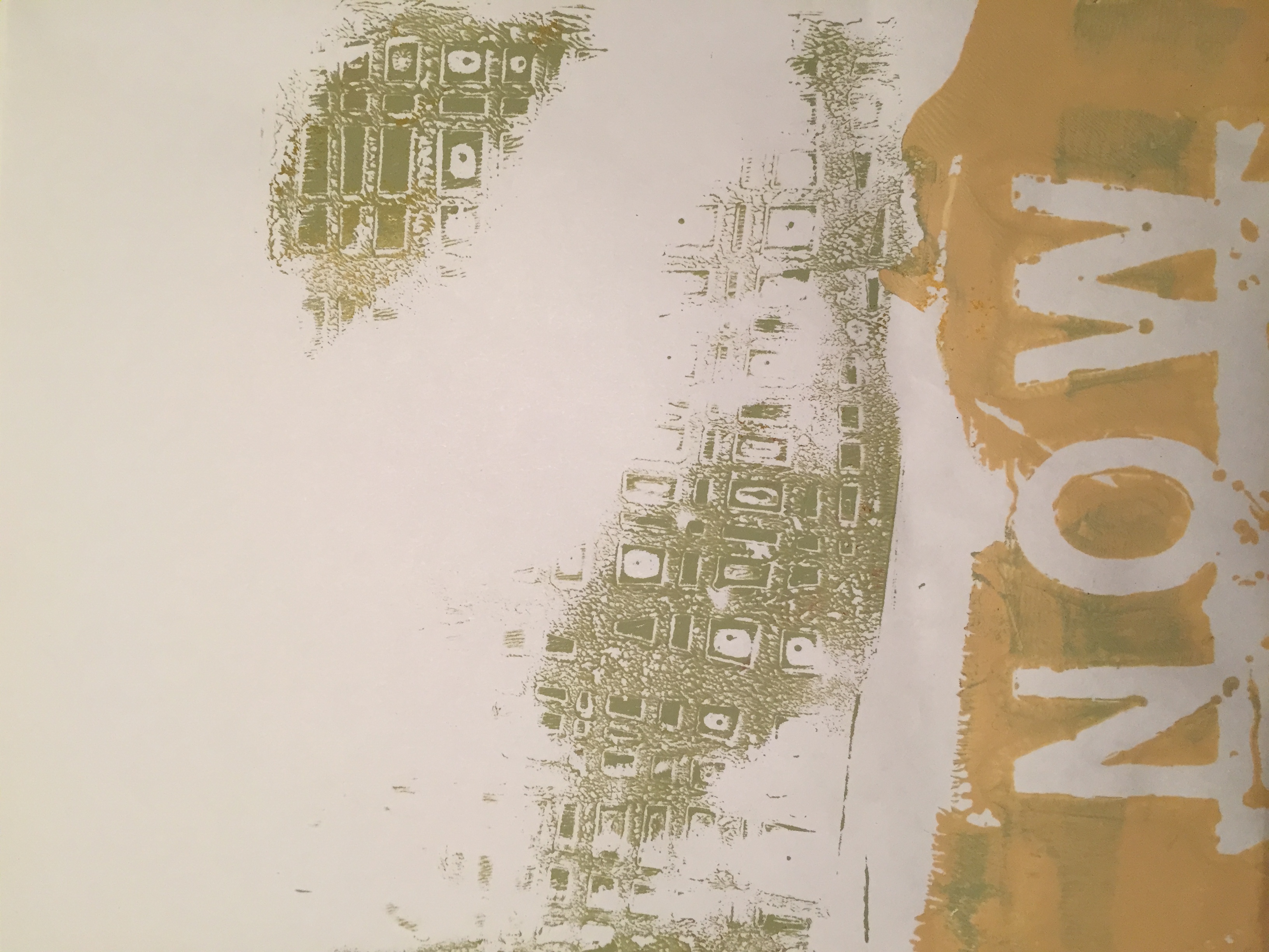 During independent work time, we made a variety of patterned prints then chose ones to create a collage. Upon spreading out the prints on my work table, three different papers stood out instantly. In my mind's eye, they immediately formed a contrasting bond…a cityscape, a barn and silo, and a field. My collage is not yet finished, as I will mount the prints on watercolor paper then coat them with matte or gloss medium (i.e. Golden brand or Mod Podge), and/or secure them behind framed glass, or make copies to create greeting cards. In addition, I may paint the watercolor paper background, add ink pen drawings or writing to my collage, or add another stencil layer, but the photo I am sharing is what I finished in class. For the collage on the left, I created the chunky "buildings" in my cityscape by rolling paint across the gel press with the brayer but I didn't entirely cover it. I pressed down a sheet of paper on top of the painted gel press, then removed and allowed it to dry. Meanwhile, you can wash the gel press to remove its paint or, instead, I rolled a second color directly over top of the previous paint. After coating it with the different color, I set a grid-pattern stencil down, pressed the previous paper over top, then removed to dry. For the print on the right, I used two metal stencils. I placed the word "now" underneath what I envisioned to be an old building in a city's warehouse district. You know, the industrial buildings that are being renovated into apartment buildings, restaurants, and shops across the country. The former grandeur and strength of what I see NOW as a "crumbling building" can be seen. That's the intrigue of the monoprinting process. Going in, the end result is uncertain.